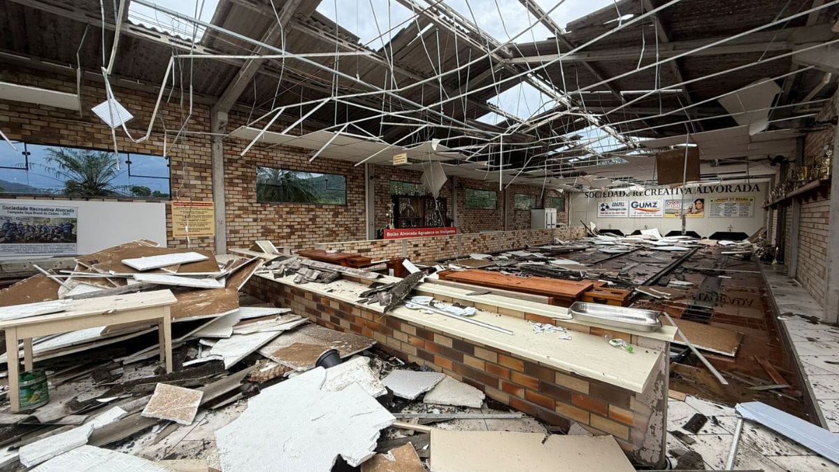 O salão da tradicional Sociedade Alvorada foi totalmente destruído pelos fortes ventos e chuva que atingiram Jaraguá do Sul entre a madrugada e a tarde desta quarta-feira (24). Equipamentos, bebidas e até o telhado foram danificados. A estimativa é de que o prejuízo chegue a R$ 350 mil.
