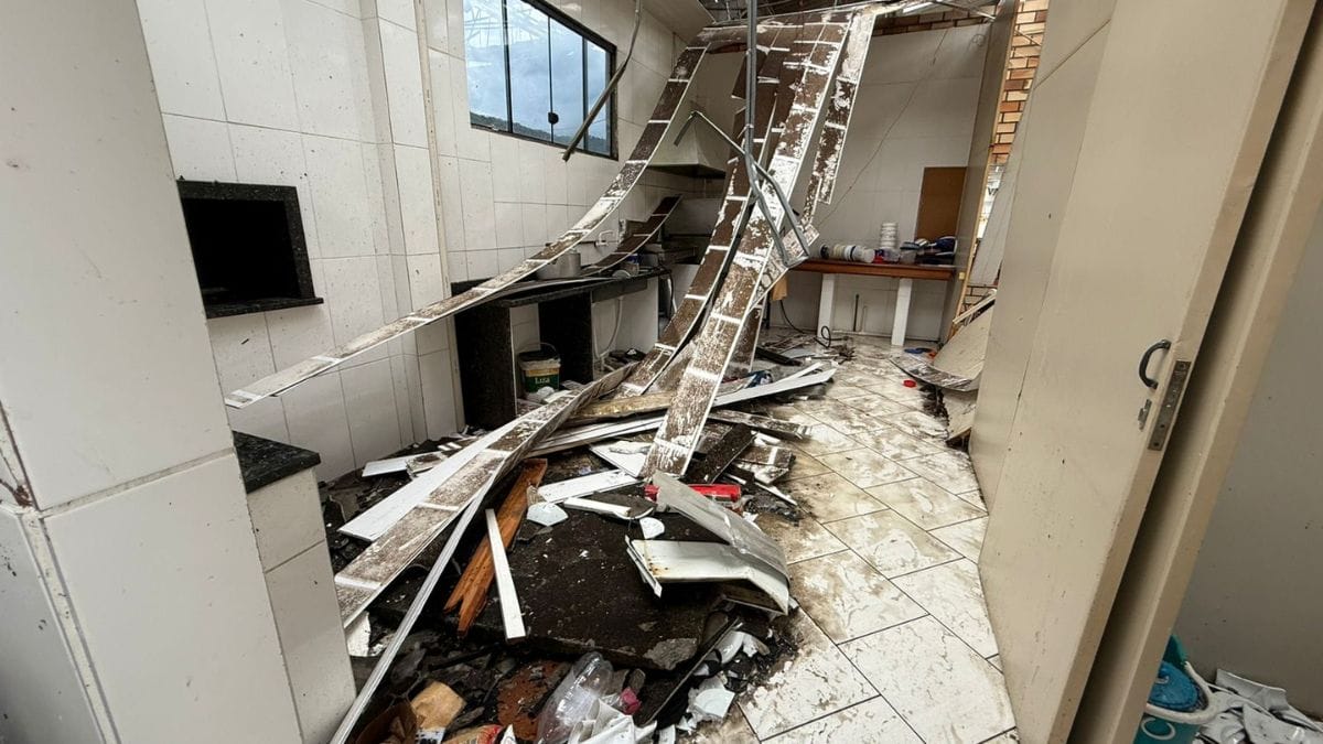 — O vento deve ter estourado a porta de vidro que a gente tinha e acabou fazendo esse estrago todo. Praticamente tudo que tem aqui dentro foi perdido. Alguma coisa que se salva é da estrutura do telhado, como eternit — conta.