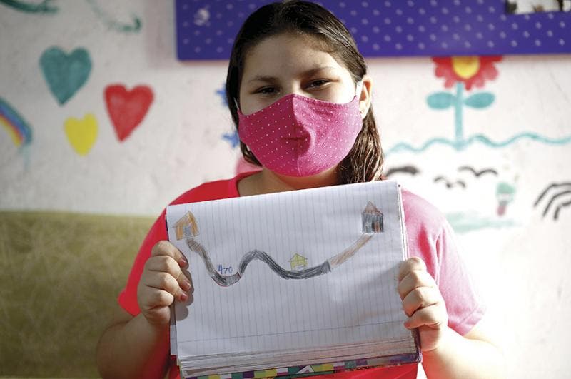 A história da BR-470 Jeniffer ainda não conhece, mas improvisa no papel um desenho para ilustrar o caminho que percorre até a escola, que fica do outro lado da rodovia. O pai leva e busca a criança de carro diariamente. Atravessar o trecho a pé, como a mãe faz, é proibido. Adriane e o marido sabem dos perigos e preferem proteger a caçula.