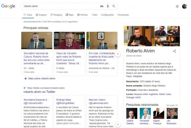 A descrição do Secretário Nacional de Cultura, Roberto Alvim, no site Wikipedia foi alterada após a divulgação do vídeo em que o integrante do governo Bolsonaro cita o discurso do ministro da propaganda de Hitler, Joseph Goebbels. Na descrição, Alvim é citado como “nazista nojento”.