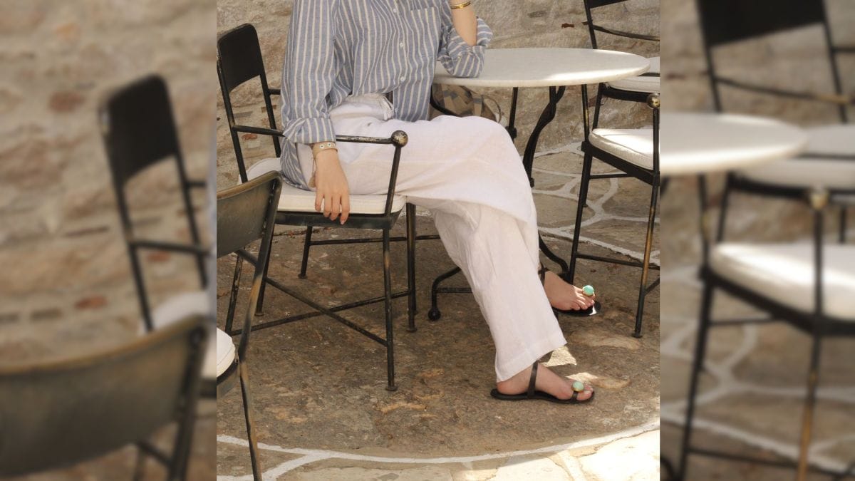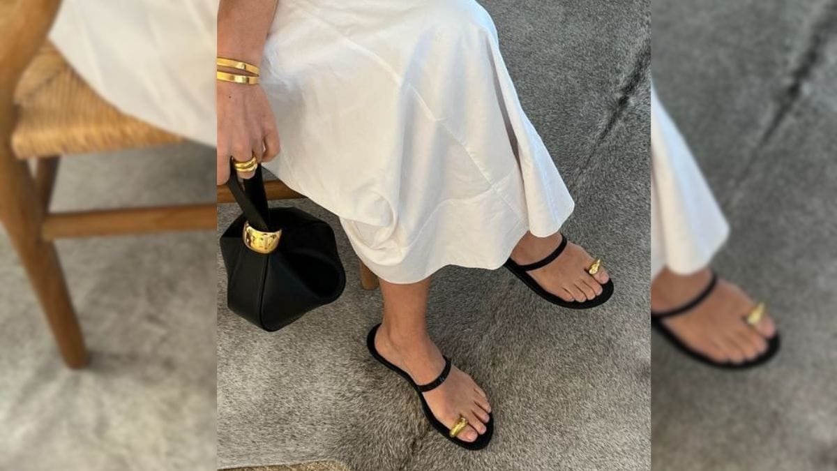 Ótimas para looks minimalistas, as rasteirinhas com anel de metal no dedão acabam tendo duas funções: são um calçado, mas também funcionam como verdadeiras bijoux nos pés, segundo a Elle.