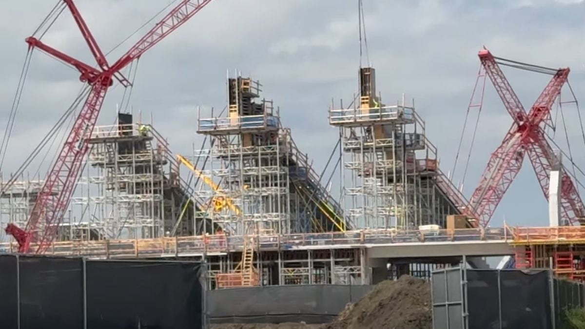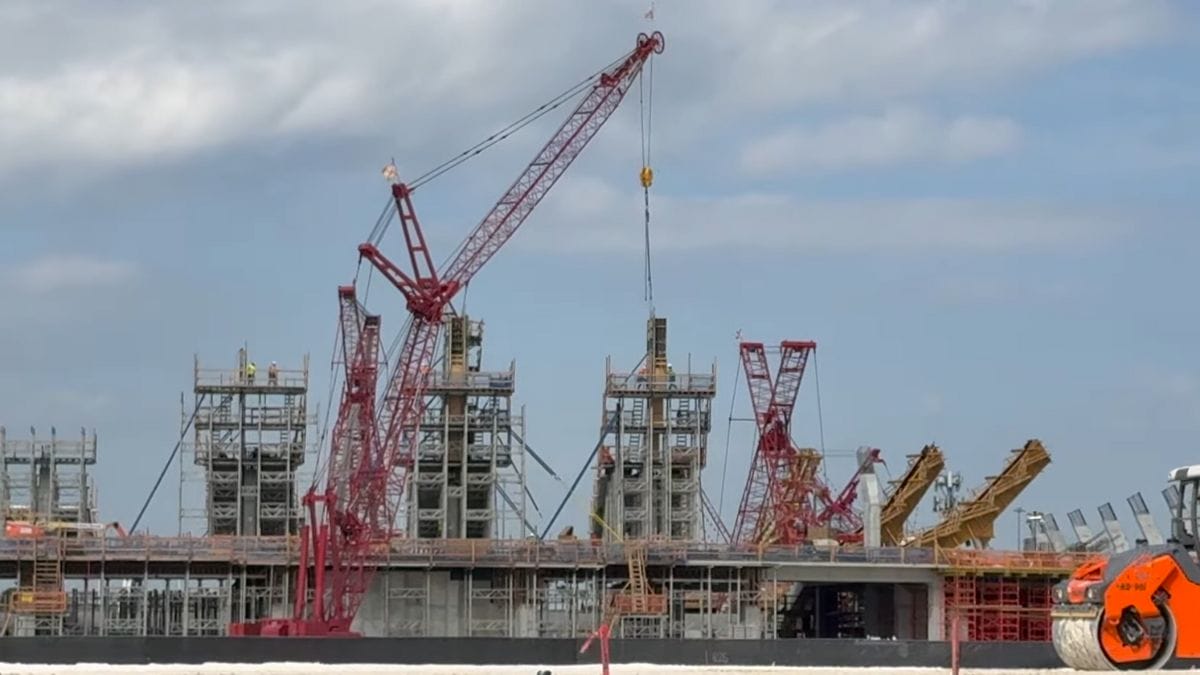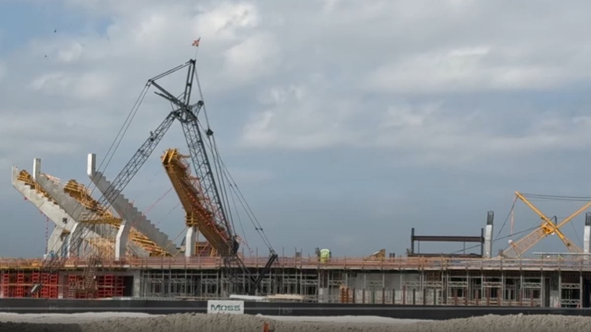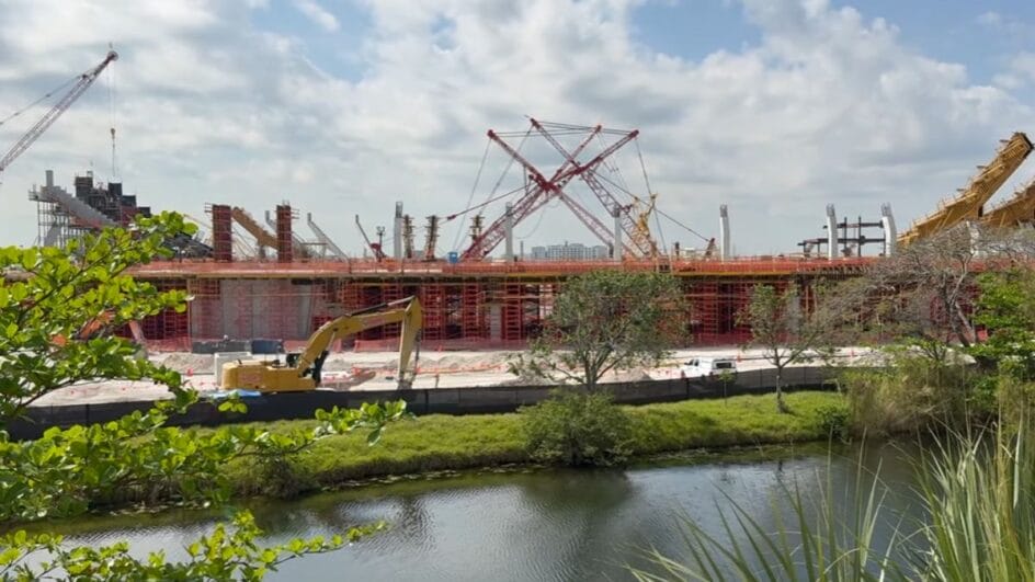 Máquinas trabalham na instalação das colunas das arquibancadas do Miami Freedom Park (Foto: Futbol Miami TV, Youtube, Reprodução)