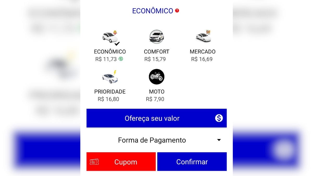 Atualmente, o aplicativo roda com cinco categorias: Econômico, sendo a mais barata; Comfort, com carros mais espaçosos; Prioridade, que prioriza o embarque em momentos de grande procura; Mercado, para passageiros que estão fazendo compras; e Moto, para transporte com motocicleta.