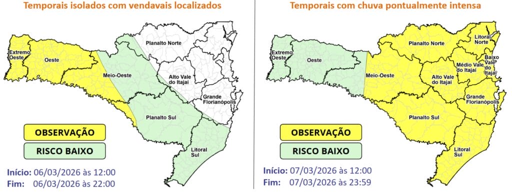 O destaque fica para as regiões litorâneas, especialmente nas áreas costeiras em todo o Litoral, abrangendo Grande Florianópolis e Vale do Itajaí, onde os temporais podem ser mais intensos e acompanhados de volumes elevados de chuva em curto período de tempo.