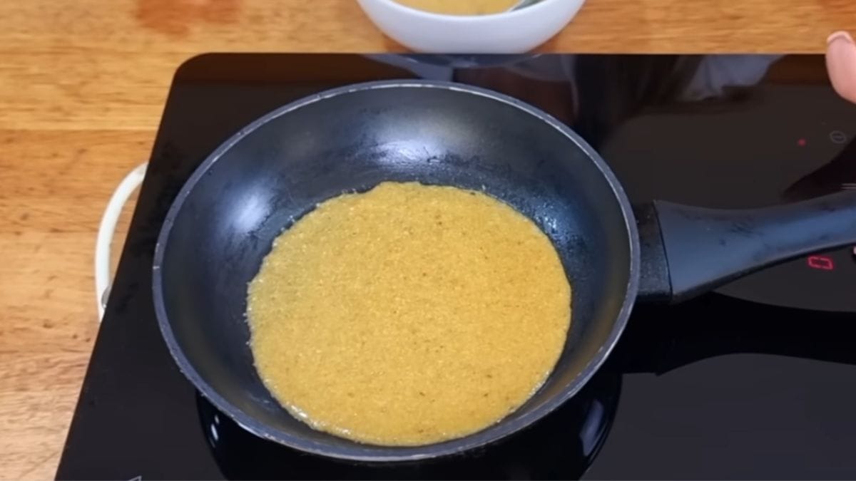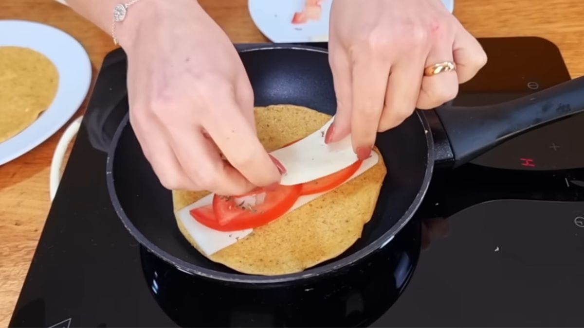 Agora, coloque a linhaça e mexa. Em seguida, leve a massa para uma frigideira com azeite e deixe cozinhar, até ficar na consistência de panqueca. Agora, recheie como preferir e feche a panqueca.