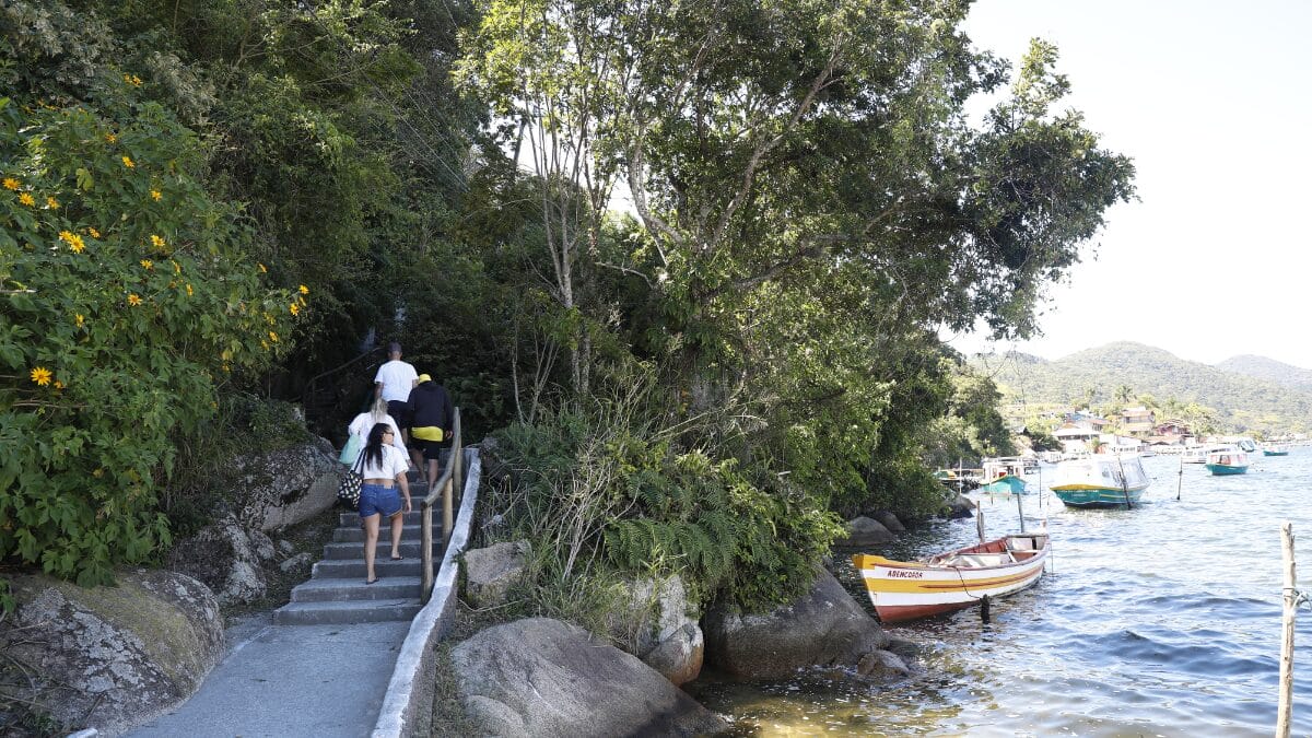 Em outras partes da trilha, a caminhada ganha casas coloridas ao redor e segue por um caminho de concreto. O trajeto se soma a curiosidade de como vivem esses moradores, rodeados pela natureza e pela Lagoa, distantes da agitação da capital catarinense, com acesso limitado, feito apenas pela trilha ou barcos.