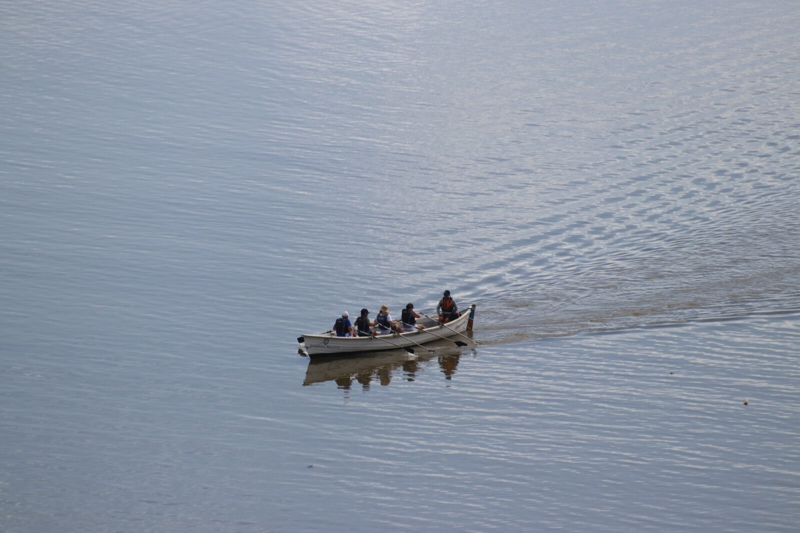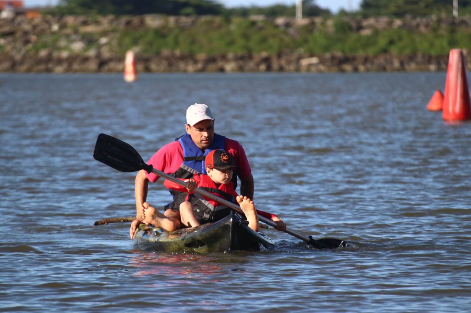 Pequeno remador se esforça para guiar a embarcação na Baía Afonso Wippel