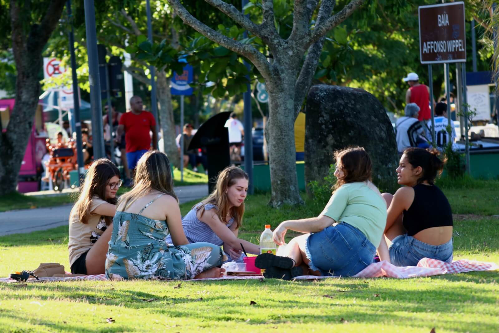 No melhor estilo piquenique, grupo de mulheres curte uma agradável tarde na Praça Genésio Miranda Lins, na Avenida Beira-Rio