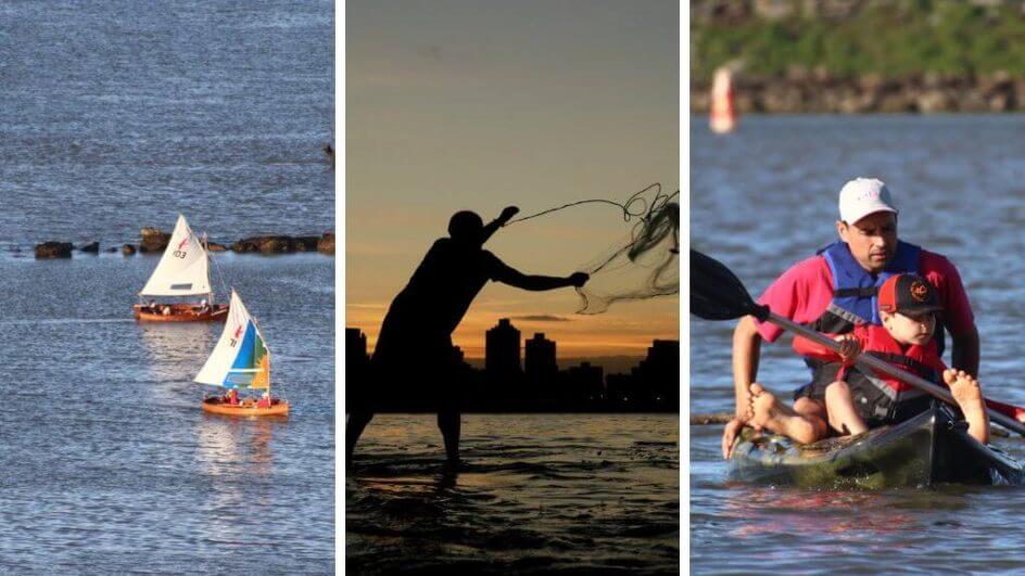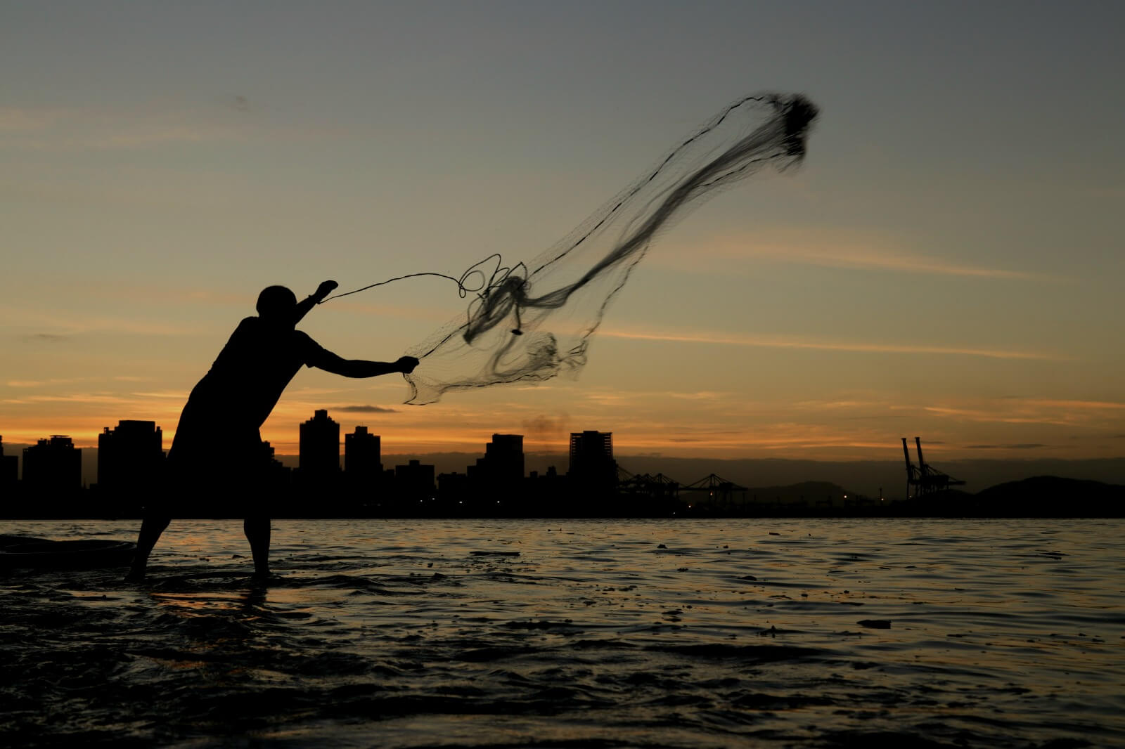 Pescador lança a rede para pescar peixes na foz do Rio Itajaí-Açu