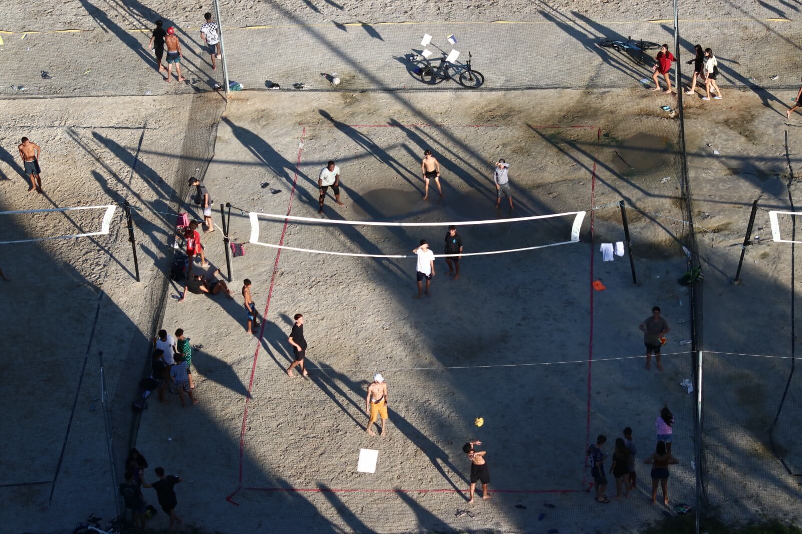 Público aproveita para praticar esportes e se divertir em uma das quadras de vôlei montadas em uma das praias de Itajaí