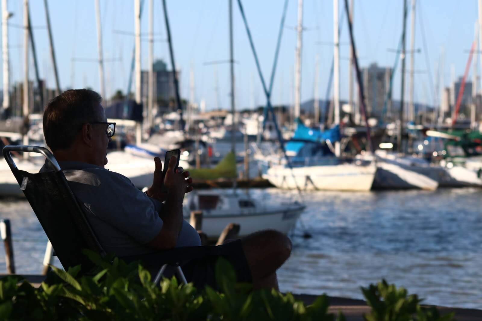 Com o celular em mãos, homem descansa e curte a paisagem do entardecer na beira do rio