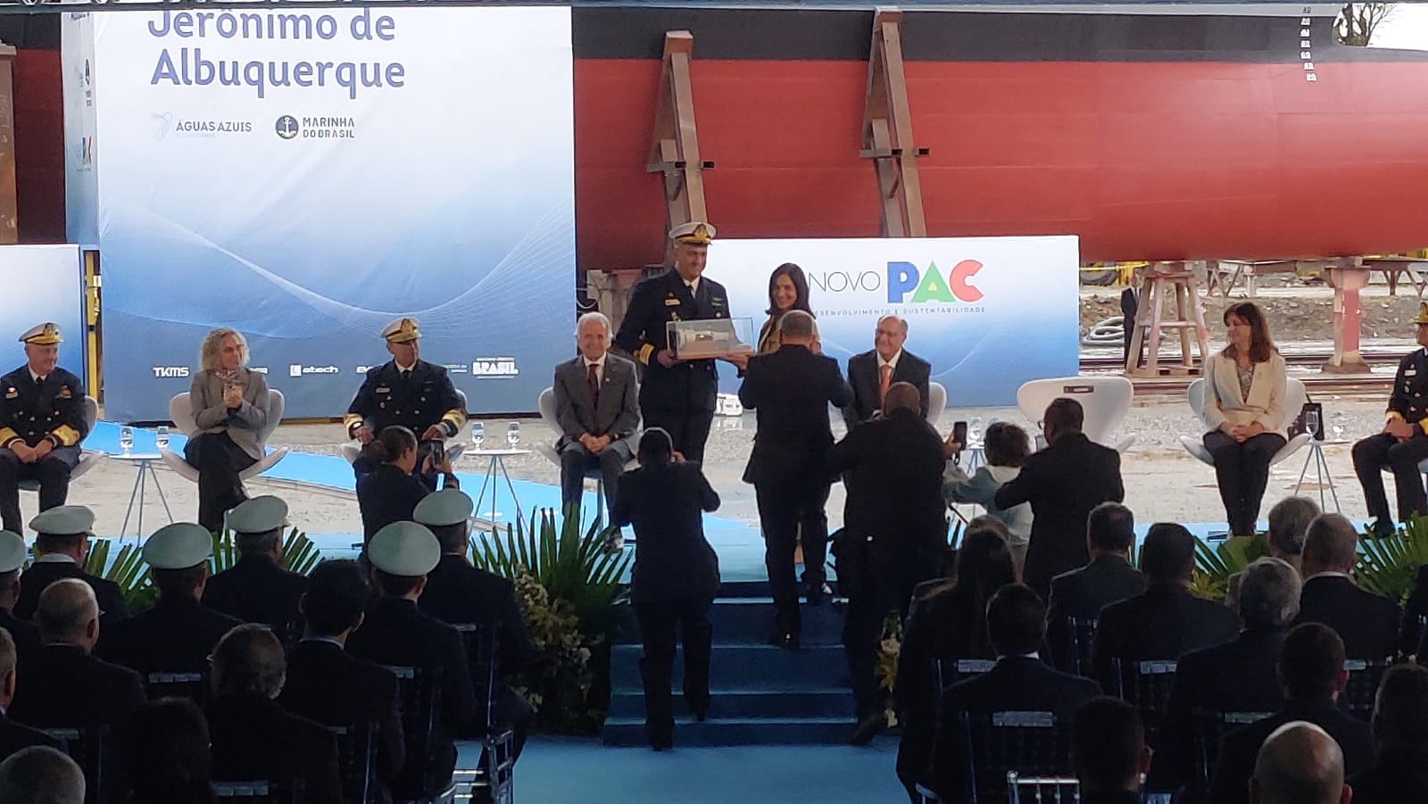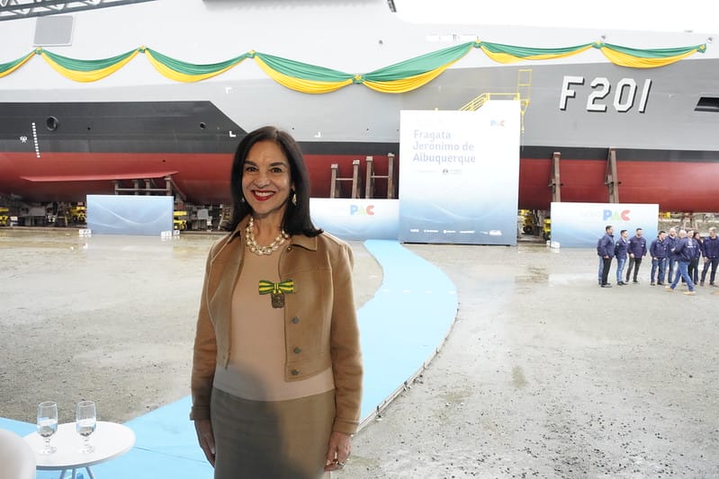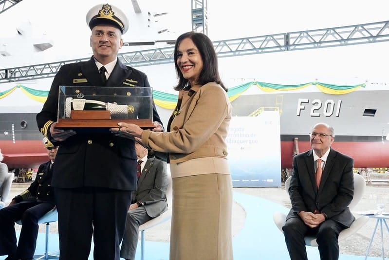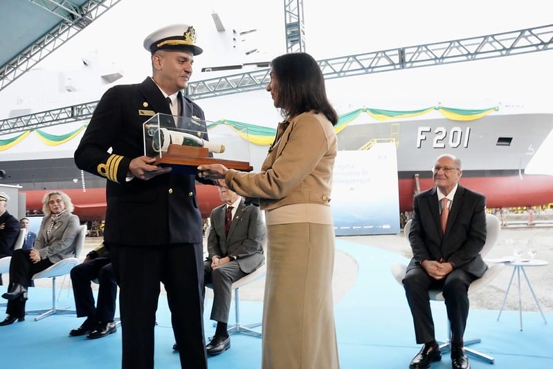 Após batizar em um ritual simbólico a fragata Jerônimo de Albuquerque, embarcação de guerra da Marinha fabricada em Itajaí e lançada nesta sexta-feira (8), a esposa do vice-presidente Geraldo Alckmin (PSB), Lu Alckmin, recebeu um presente da Marinha. O agrado foi entregue como forma de a segunda-dama recordar o papel de madrinha da embarcação.