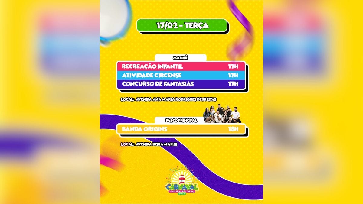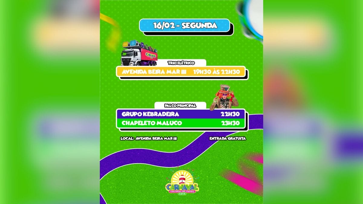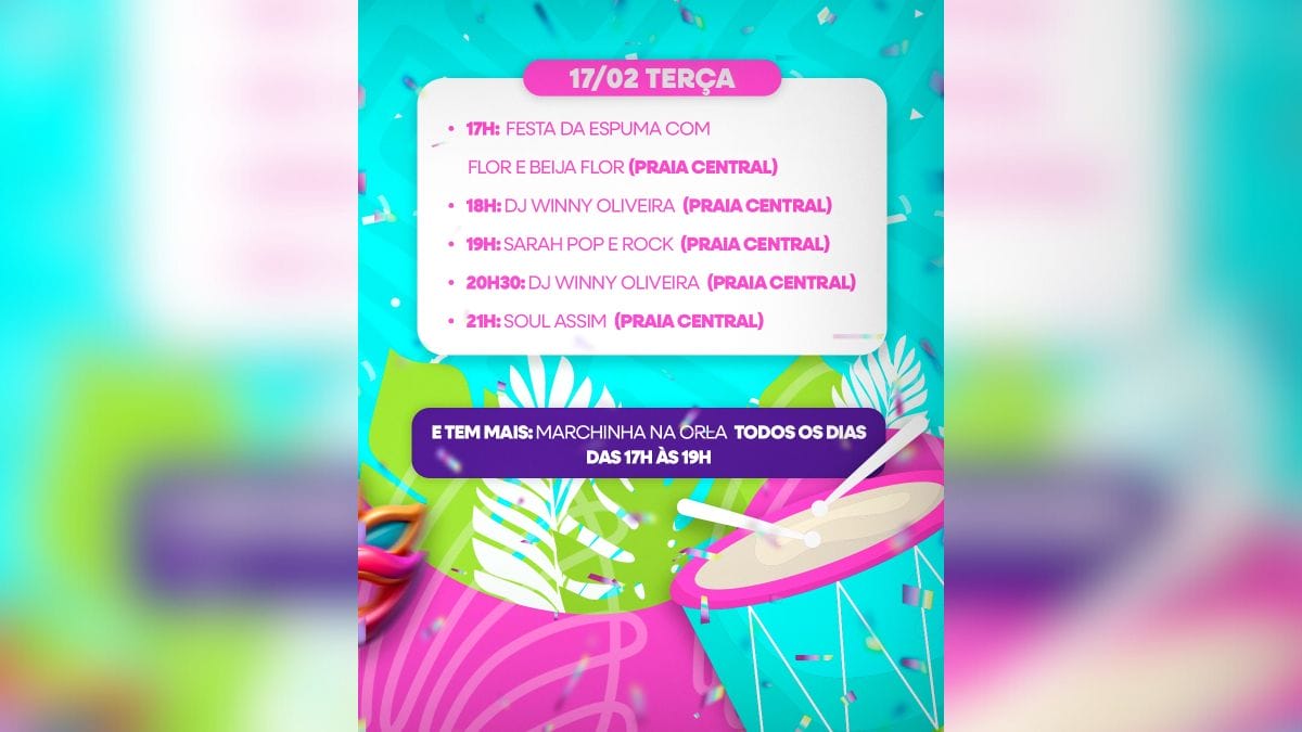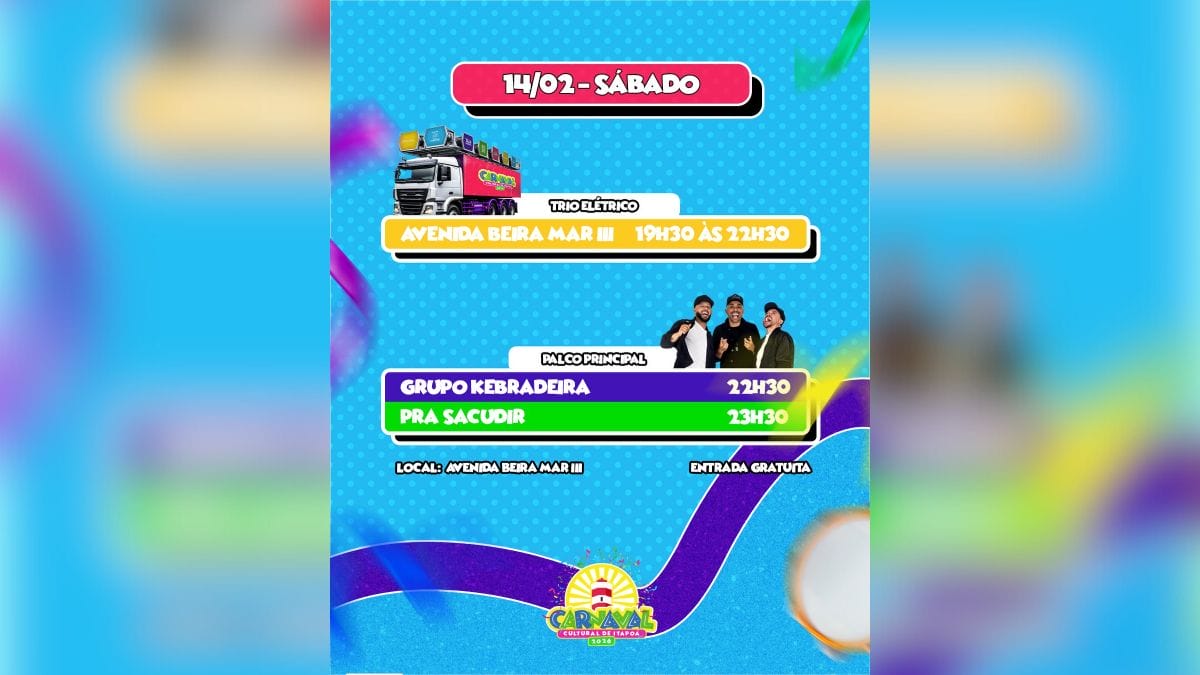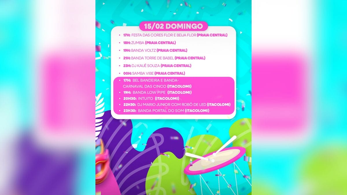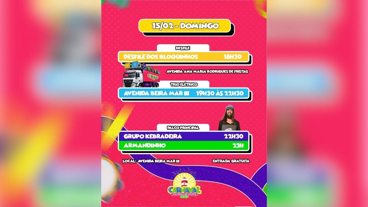 Já em Itapoá, a folia vai durar quatro dias. O grande destaque do Carnareia 2026 é o show nacional do Armandinho, que ocorre no domingo às 23h. Além dele, a programação inclui apresentações de bandas como Grupo Kebradeira, Pra Sacudir, Banda Origins e Chapeleto Maluco.