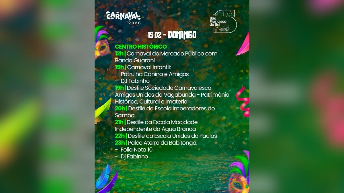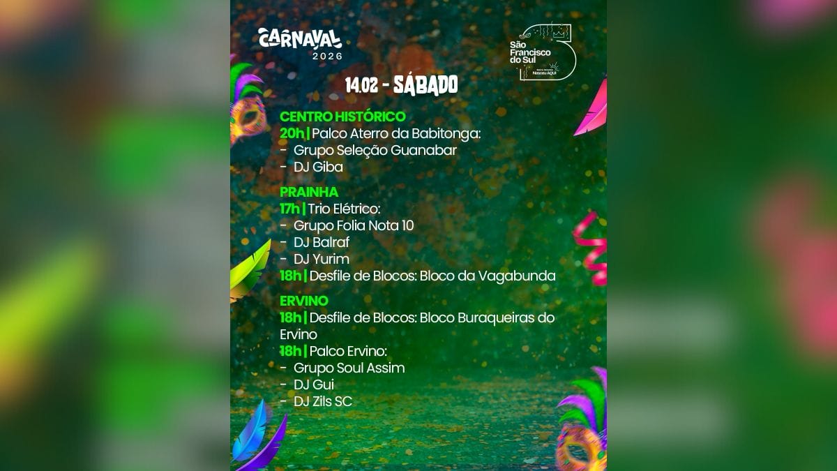 A cidade mais antiga de Santa Catarina preparou uma programação diversificada e descentralizada, com desfiles de blocos, escolas de samba, shows musicais, trio elétrico e atrações para todas as idades. As atividades serão realizadas no Centro Histórico, Prainha, Ervino, Vila da Glória e Ubatuba.