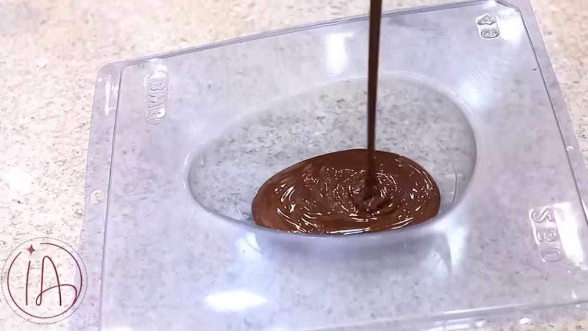 Pegue uma forma de plástico em forma de ovo de Páscoa de colher e coloque o chocolate. Deixe na geladeira por uma hora.