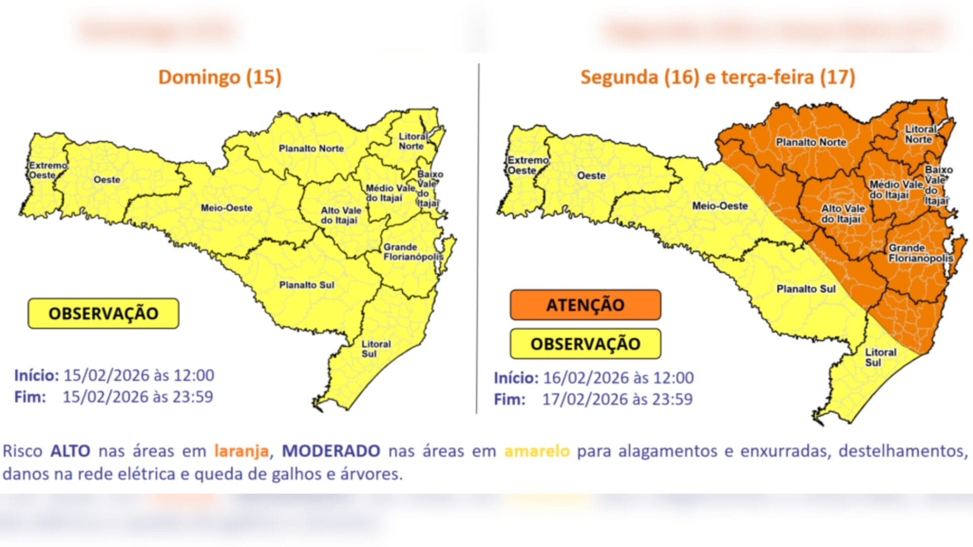 A Defesa Civil de Santa Catarina já havia emitido, no domingo (15), um aviso meteorológico para temporais com chuva intensa até a terça-feira. Isso porque, a partir de segunda-feira, o calor volta a se intensificar no Estado. Com o maior aquecimento, a instabilidade também aumenta e, com isso, o risco para ocorrências relacionadas a alagamentos e enxurradas, além de destelhamentos, danos na rede elétrica e queda de galhos e árvores, volta a ficar alto nas áreas em laranja do mapa, tanto na segunda (16) quanto na terça-feira (17).