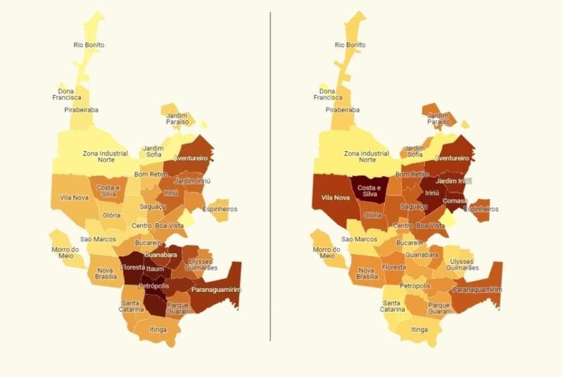 Entre os dez bairros com mais casos, nove ficavam nesta região da cidade: Petrópolis (1.553), Floresta (1.286), Itaum (1.234), Boehmerwald (1.189), Fátima (925), João Costa (881), Paranaguamirim (772), Guanabara (702) e Adhemar Garcia (629. O “intruso” foi o Aventureiro, com 638 casos.