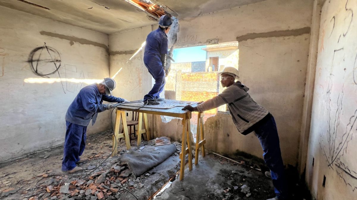 O desmonte da estrutura do conjunto de dois avança na parte superior da construção. Os operários realizam o corte por meio de rompedores manuais. Esses equipamentos são ideais para a demolição de estruturas de concreto em locais de difícil acesso. Desse modo, há uma maior precisão e segurança durante os trabalhos.