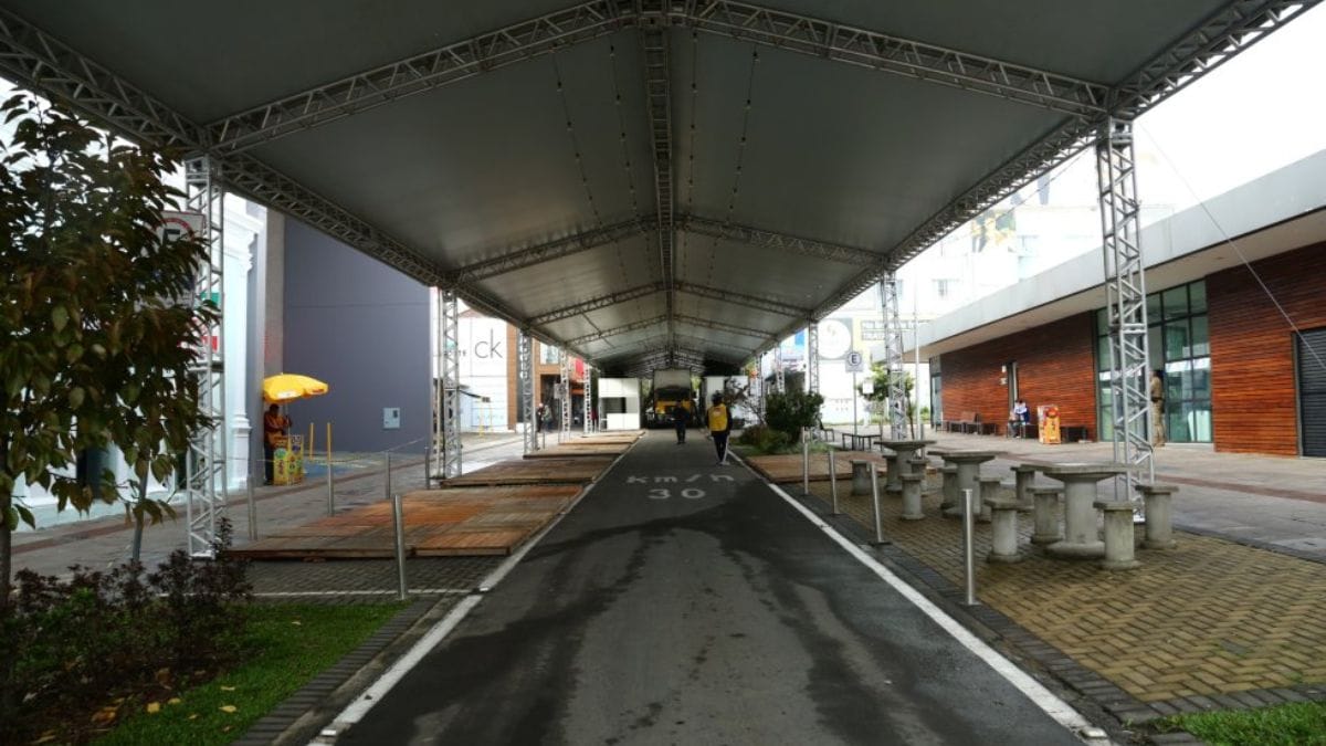A parte superior da rua Nereu Ramos recebeu uma estrutura coberta com 103 metros de extensão, onde nove entidades filantrópicas comercializam pratos típicos à base de pinhão, além de bebidas tradicionais como quentão e ponche.