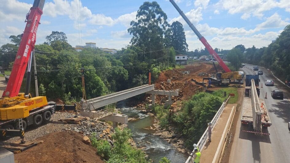As obras de implantação de vias marginais na BR-282, em Maravilha, no Oeste de Santa Catarina, seguem avançando e já atingiram uma das etapas mais importantes do projeto: o lançamento das vigas da nova ponte sobre o Rio Iracema.