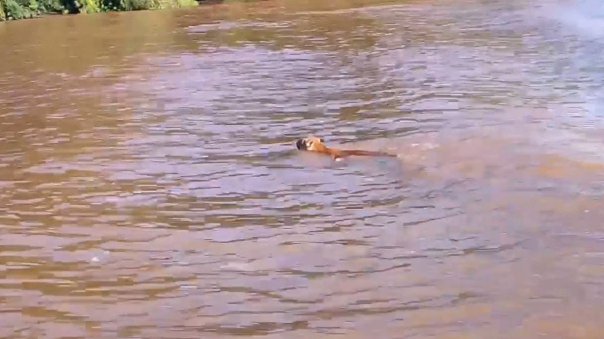 O animal foi visto nadando no rio e chamou a atenção dos agentes. Um deles chegou a mencionar que achou que se tratava de um tronco quando, na verdade, era o felino.