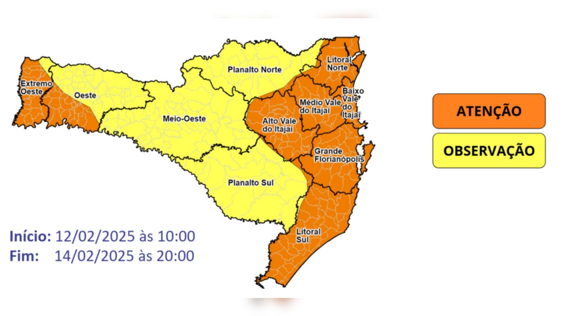 A onda de calor que “sufoca” Santa Catarina nos últimos dias deve se estender, pelo menos, até sexta-feira (14), alerta a Defesa Civil. Antes, a previsão era de que o calor diminuísse a partir desta quinta (13). As regiões da Grande Florianópolis, Litoral Norte e Sul, Vale do Itajaí, Extremo Oeste e parte do Oeste estão com risco alto para desconforto térmico, desidratação e agravamento de doenças cardiorrespiratórias, de quarta (12) até sexta-feira.