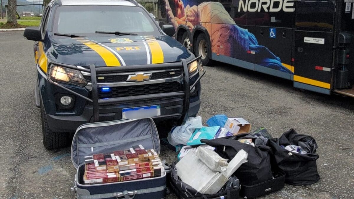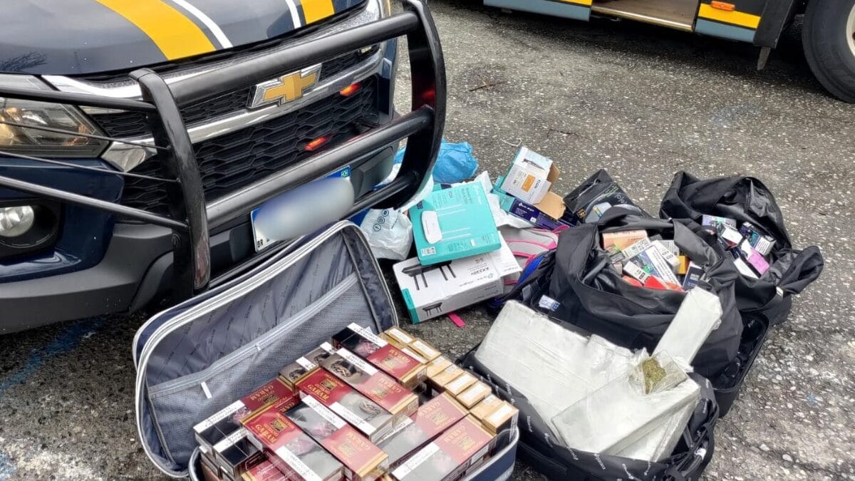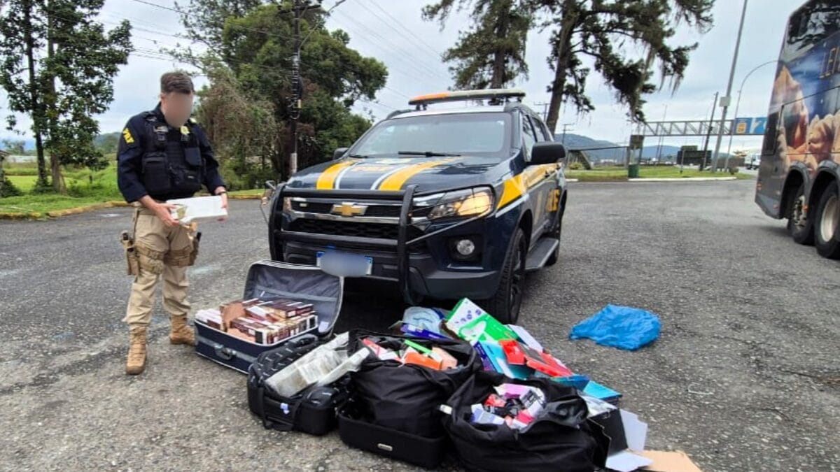 Três passageiros de um ônibus vindo do Paraguai foram detidos na BR-101, em Joinville, nesta segunda-feira (25). Com uma dupla, a Polícia Rodoviária Federal (PRF) encontrou mais de 1,5 mil maços de cigarros comuns e 290 unidades de cigarros eletrônicos, os “vapes”. Já um menor de idade apreendido levava 26 quilos de maconha.