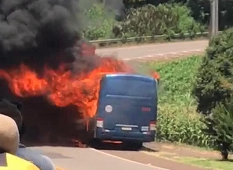 Um ônibus com cerca de 25 passageiros pegou fogo em Lacerdópolis, no Oeste de SC, nesta quinta-feira (2). O acidente ocorreu na SC-150, no início da tarde, às 12h45. O ônibus foi completamente destruído pelas chamas, mas os passageiros conseguiram fugir a tempo. As informações são do G1 SC.