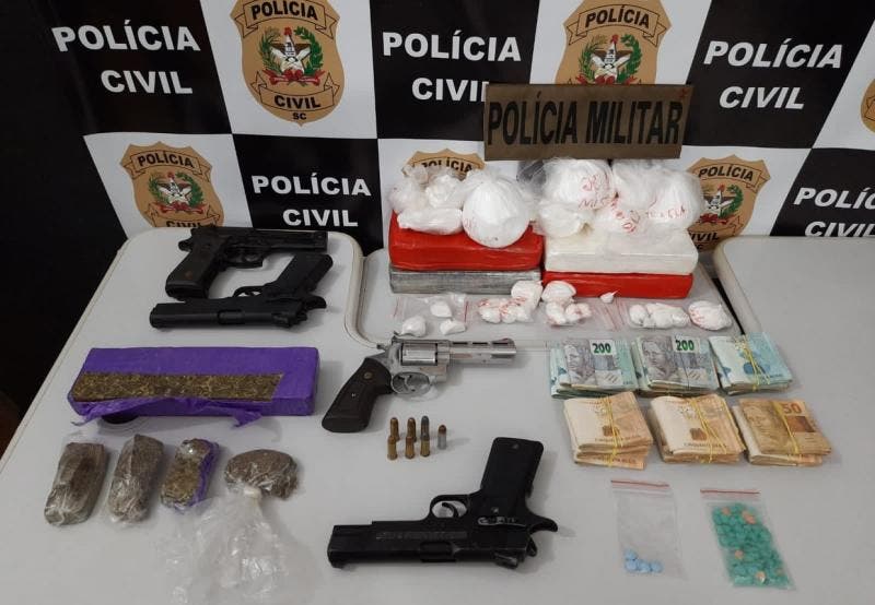 Cerca de R$ 20 mil em espécie foram apreendidos pela polícia, que também encontrou seis quilos de cocaína, 95 comprimidos de ecstasy, aproximadamente um quilo de maconha, um revólver .38, três simulacros de pistola, uma balança de precisão e munições.