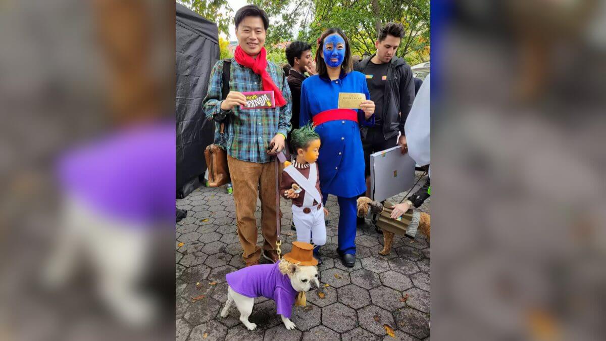 Nos 12 anos em que a família Kam participou do desfile, Penny se juntou a eles oito vezes. Vestido como Willy Wonka este ano, o buldogue francês estava cercado por personagens de Charlie e a Fábrica de Chocolate.