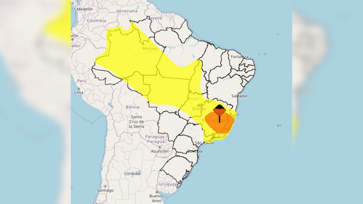 Entre os estados listados, três deles estão sob alerta laranja (perigo): Minas Gerais, Espírito Santo e Rio de Janeiro. A previsão da região indica chuva entre 30 a 60 mm/h, com risco de alagamentos, deslizamentos de encostas e transbordamentos de rios nos munícipios dentro da área de risco.