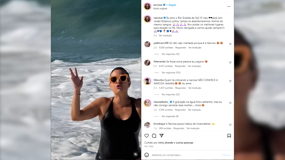 “Vamos ajudar o Rio Grande do Sul”, diz Narcisa no vídeo em que aparece saindo d’água do mar.