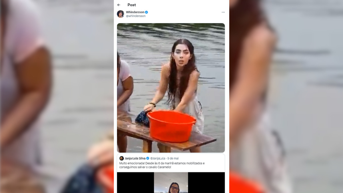 Em outro post, o youtuber repostou um vídeo em que Janja comenta o resgate do cavalo Caramelo. Whindersson compartilhou o post com um meme da atriz Jade Picon lavando roupas na margem de um rio, em cena da novela “Travessia”.