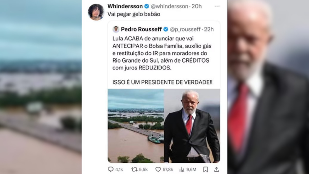 “Vai pegar gelo, babão”, disse Whindersson, compartilhando um post de Pedro Rousseff, o sobrinho-neto da ex-presidente Dilma. Na publicação, Pedro dizia que Lula anteciparia o auxílio do Bolsa Família para as vítimas da tragédia.