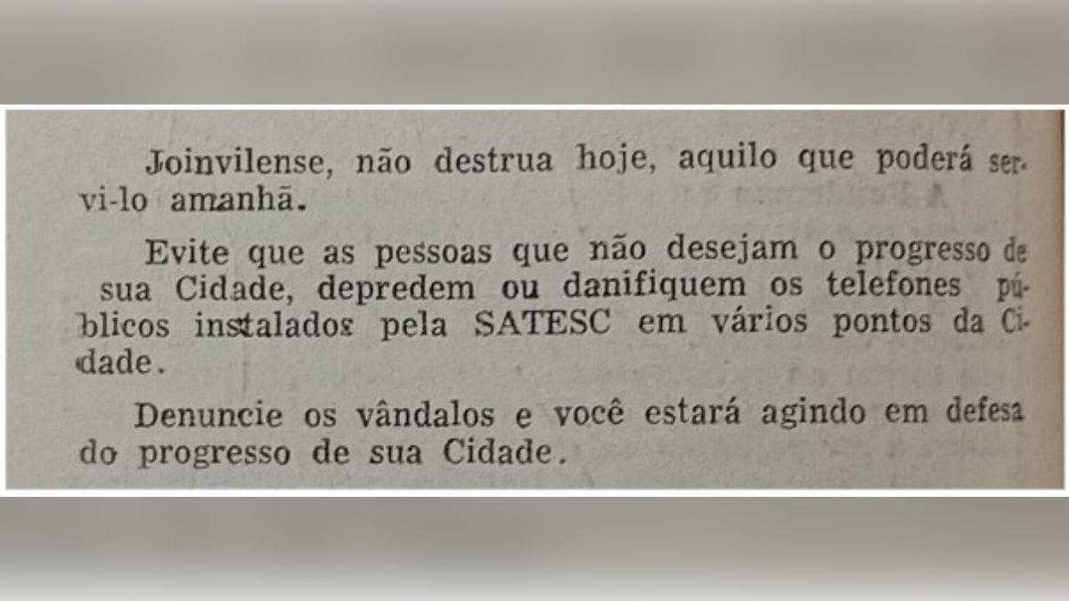 — Naquele tempo ainda não havia a Telesc, e no ramo das telecomunicações, o estado era atendido por duas empresas, a Cotesc e a Satesc. Já em junho daquele ano, a Cotesc anunciou que brevemente instalaria telefones públicos em Joinville, Blumenau e Florianópolis — conta.