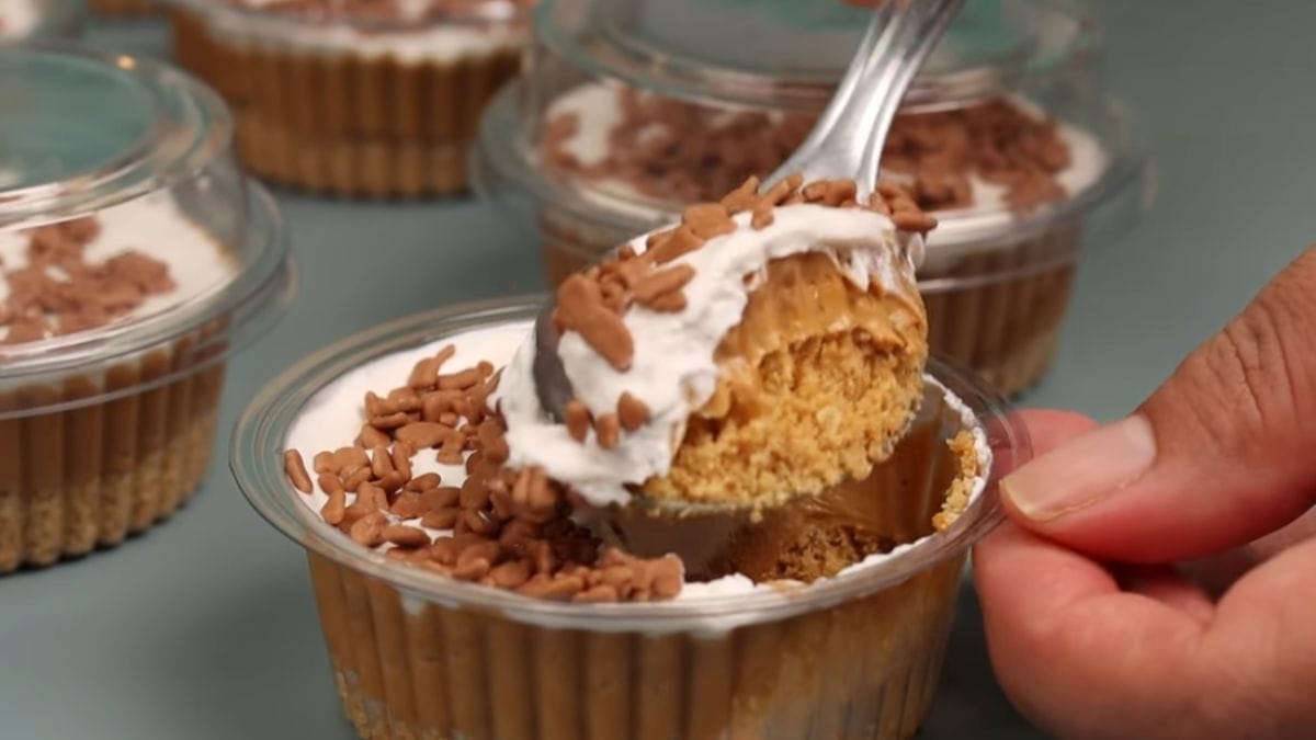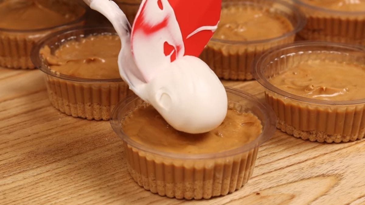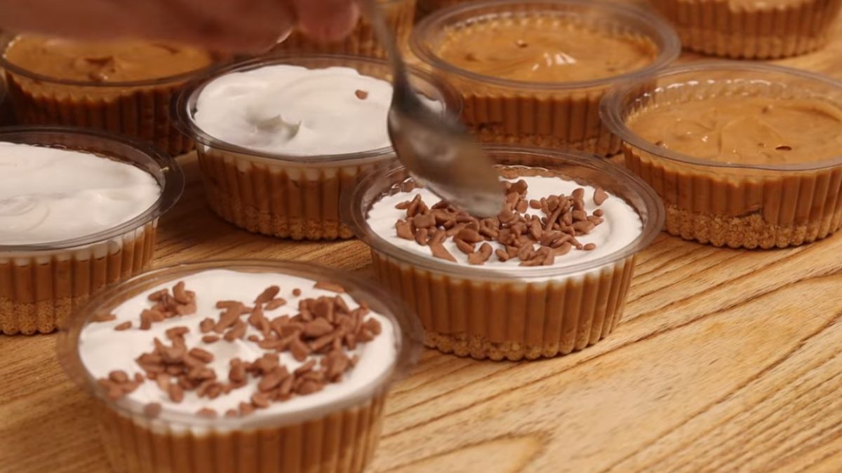 Agora, misture o doce de leite com o chantilly em um recipiente. Em seguida, separe potinhos de plástico para colocar a torta.