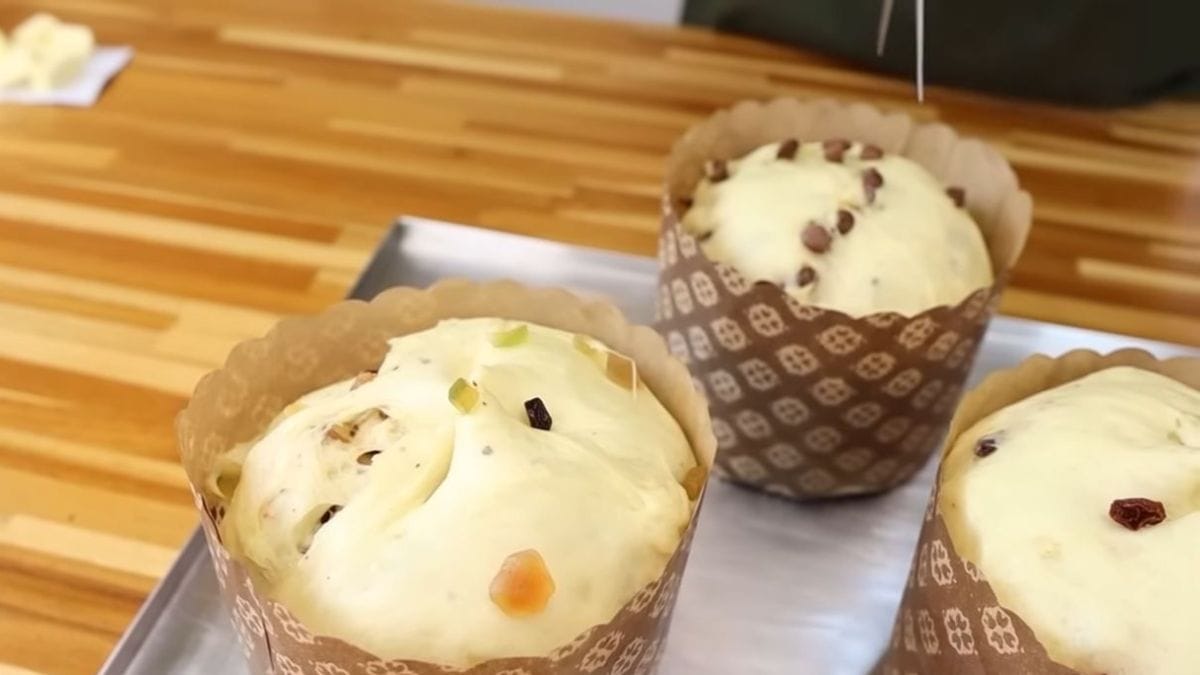 Modele a massa em formatos arredondados e coloque em formas específicas para panetone de 500 g, deixando a massa crescer novamente.