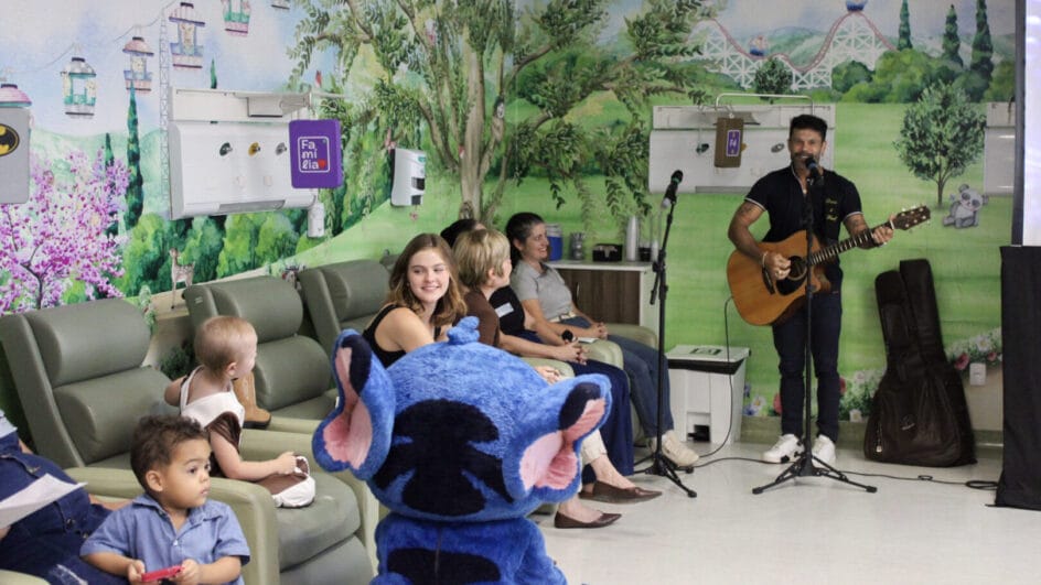 Na oncologia pediátrica, o artista foi surpreendido com homenagens e músicas preparadas especialmente para a ocasião. Em um momento de muita emoção, Marcos se sensibilizou com o carinho dos pequenos, fez uma oração, cantou e levou palavras de fé, esperança e força para os pacientes.