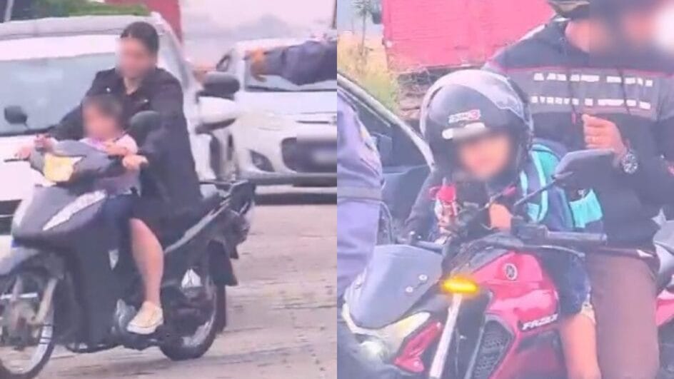 É proibido transportar menores de dez anos em motocicletas, conforme estabelece o Código de Trânsito Brasileiro. Alguns usavam capacete, enquanto outros estavam sem proteção alguma. Em um dos flagrantes, um homem que estava com uma criança sentada no guidão e com capacete tentou fugir da abordagem.