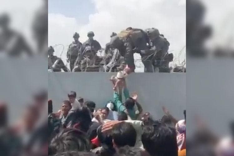 Nas imagens da multidão de pessoas no aeroporto de Cabul, capital do Afeganistão, é possível ver as crianças e bebês sendo passadas por cima do muro com arame farpado aos militares.