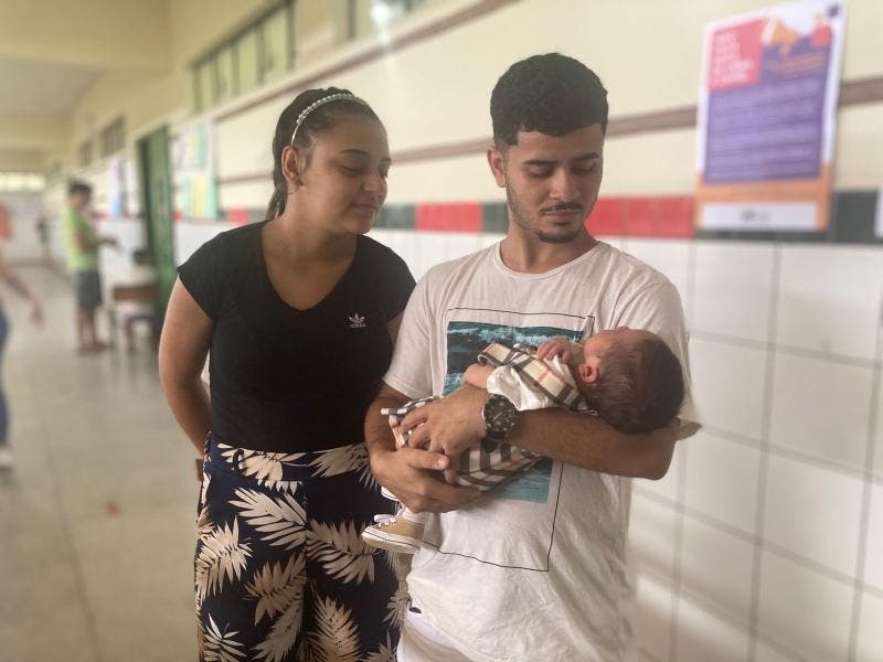 Bryam conta que, no primeiro turno, o pequeno Samuel ainda estava na barriga da mamãe e, desta vez, “votou” na Escola de Educação Básica Professora Antônia Alpaídes Cardoso dos Santos, no bairro Nova Brasília, nos braços do pai.