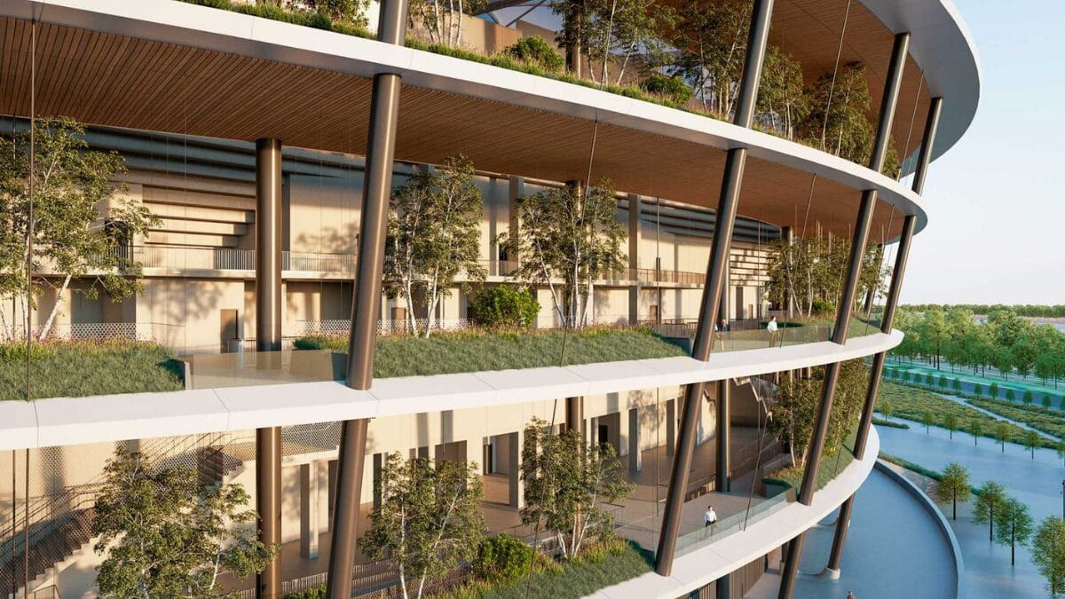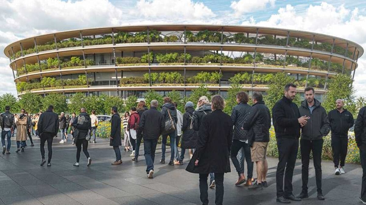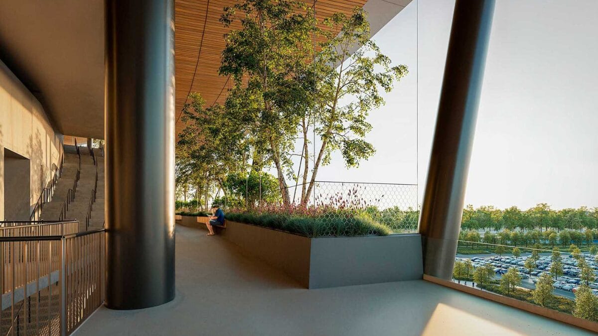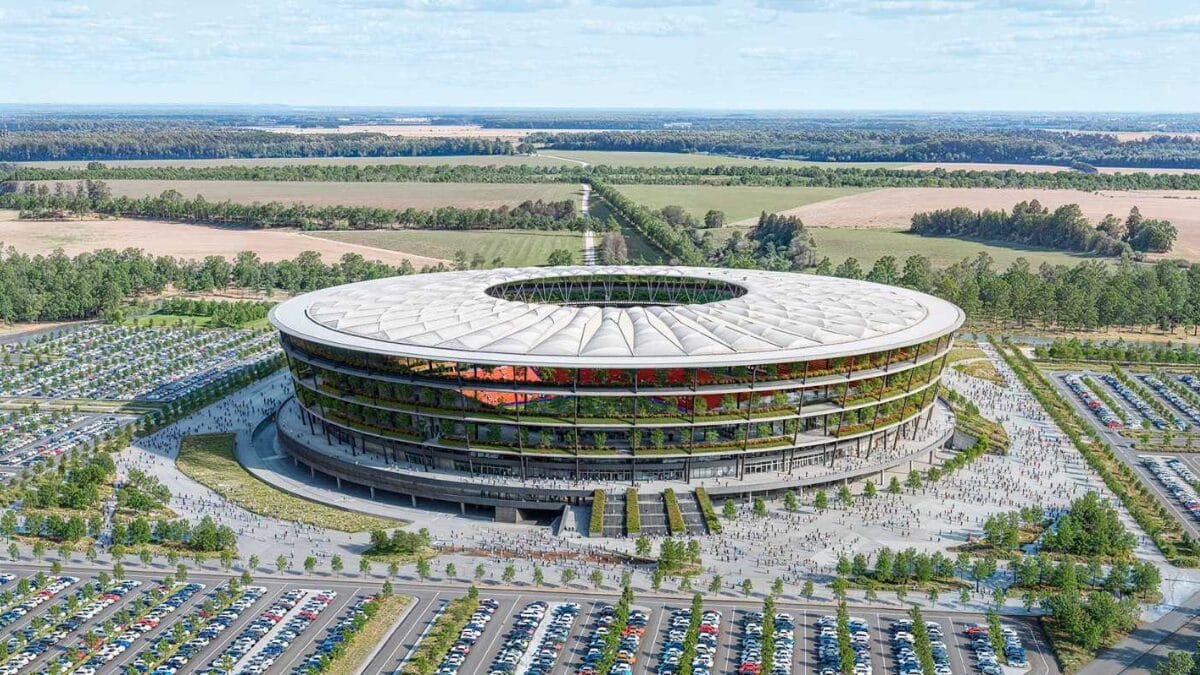 Os jardins verdes e os elementos de madeira na fachada levam a associações com o Estádio Olímpico de Tóquio enquanto seu formato circular pode lembrar o Mané Garrincha, em Brasília.
