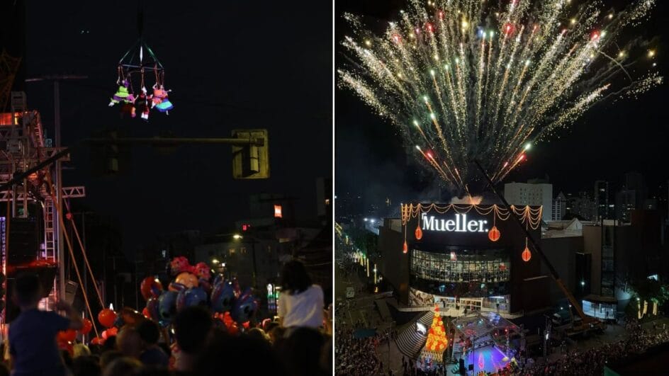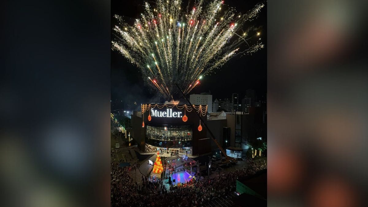Quem estava no centro de Joinville na noite dessa quinta-feira (20) acompanhou um momento mágico. No céu, o papai noel do Shopping Mueller surgiu de helicóptero e ainda dançou no ar com bailarinas. A apresentação natalina marcou a inauguração da nova fachada do local.