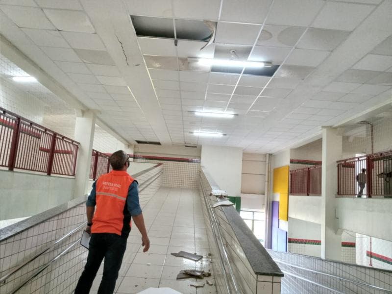 Com o extravasamento da estrutura, a água rompeu o gesso, que caiu sobre as rampas e os corredores do educandário.