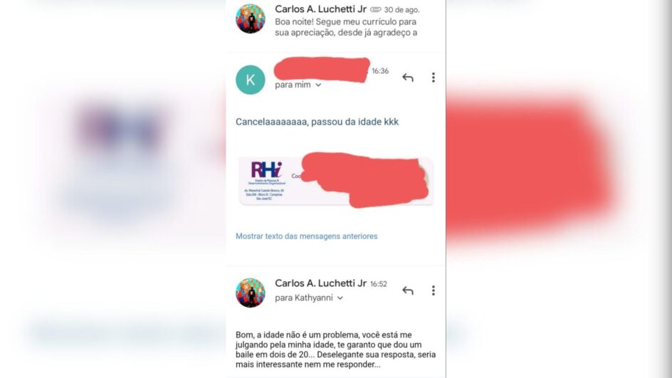 Na época, Carlos Augusto Luchetti Junior havia enviado o currículo para a empresa e recebeu por e-mail a resposta “Cancelaaaaaaaa, passou da idade kkk” de uma especialista em recrutamento. Ele aplicava para a vaga de auxiliar de estoque em São José.