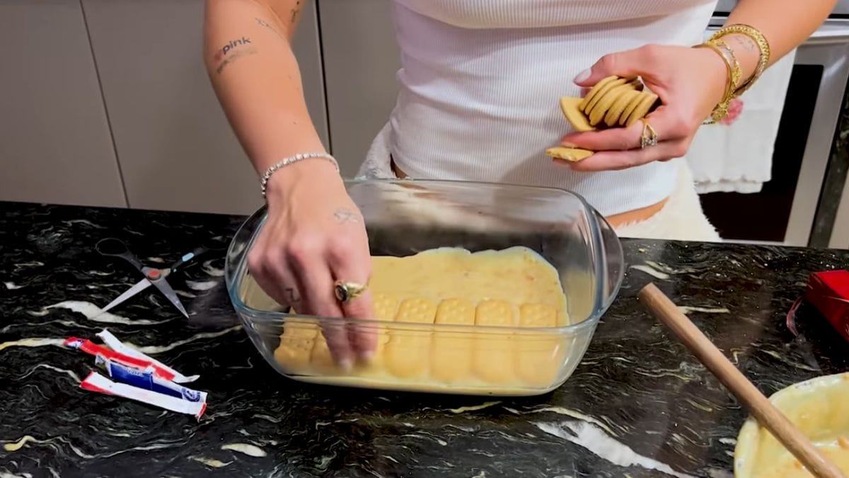 Em seguida, monte as camadas. Em uma travessa, espalhe uma camada fina de creme no fundo. Molhe rapidamente alguns biscoitos Maizena no leite, apenas o suficiente para amolecer levemente, sem deixar encharcado.