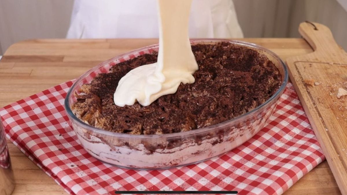 Continue alternando camadas de creme, chocotone umedecido no café e cacau até finalizar com uma camada de creme por cima. Leve à geladeira por pelo menos duas horas para firmar o creme e permitir que os sabores se misturem.