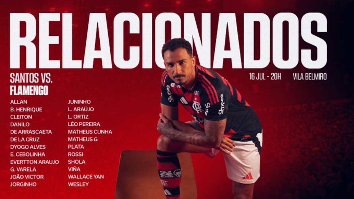 O Flamengo divulgou, na manhã desta terça-feira (15), a lista de relacionados para a partida contra o Santos, pela Série A do Campeonato Brasileiro. O atacante Pedro ficou de fora da relação pela segunda vez consecutiva e não estará a disposição do técnico Filipe Luís em meio a rumores de saída do Rubro-negro. A partida acontece na quarta-feira (16), às 20h (de Brasília).