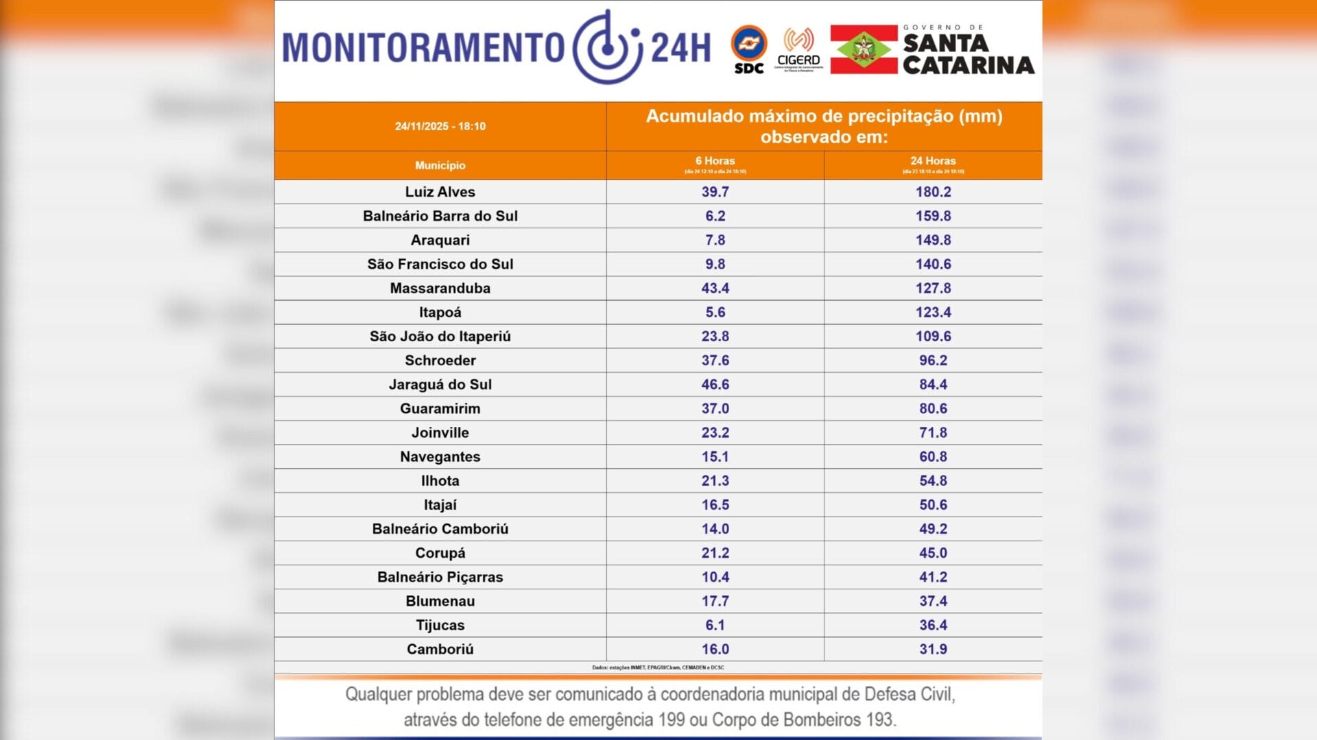 Nas últimas 24 horas, o município de Luiz Alves, no Vale do Itajaí, já foi atingido por 180 milímetros de chuva. Nas últimas seis horas, foram quase 40 milímetros. Em seguida, vem Balneário Barra do Sul, com 159 milímetros nas últimas 24 horas, e Araquari, com 149 (veja a lista abaixo).