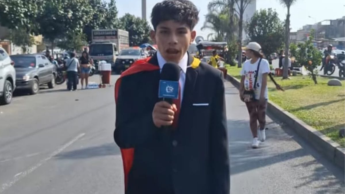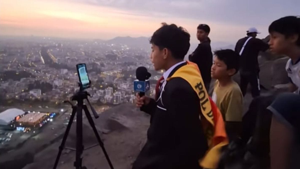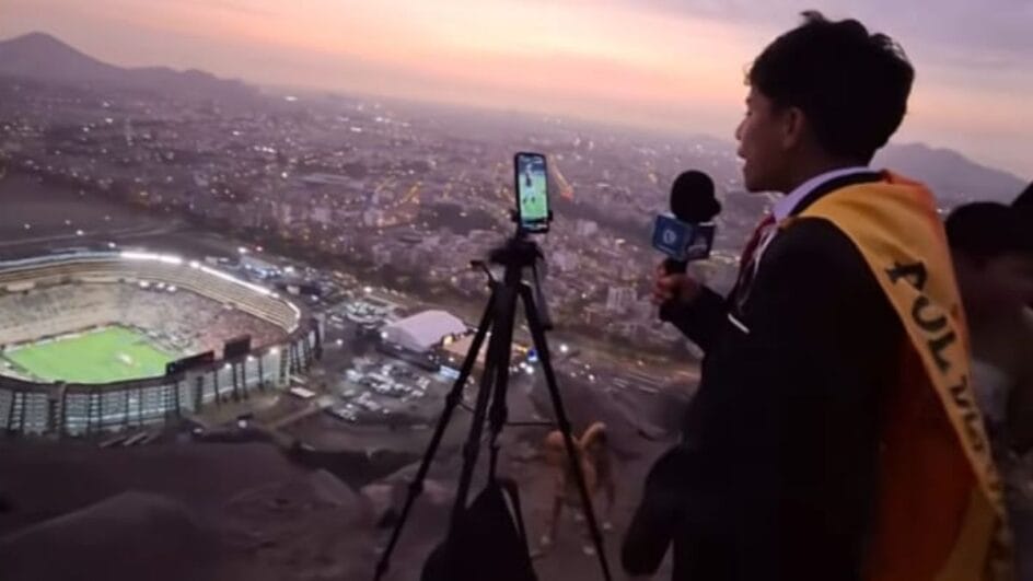 Para chegar a Lima, ele teve que viajar 18 horas desde Andahuaylas, sua cidade natal. Sem conseguir as credenciais para cobrir a partida de dentro do Estádio Monumental, ele encontrou um jeito bem original de narrar a decisão. Com a ajuda do irmão, o jovem subiu em cima de uma das montanhas que cercam o estádio e transmitiu a partida de lá.